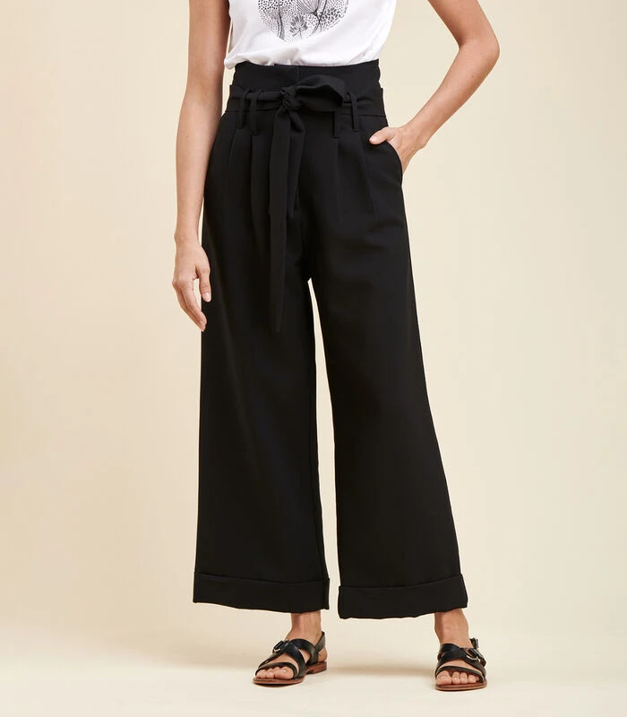 Loszittende, hoog getailleerde broek met riem en wijde pijpen. Twee haak en oog sluitingen, verwijderbare geknoopte tailleband, ritssluiting.