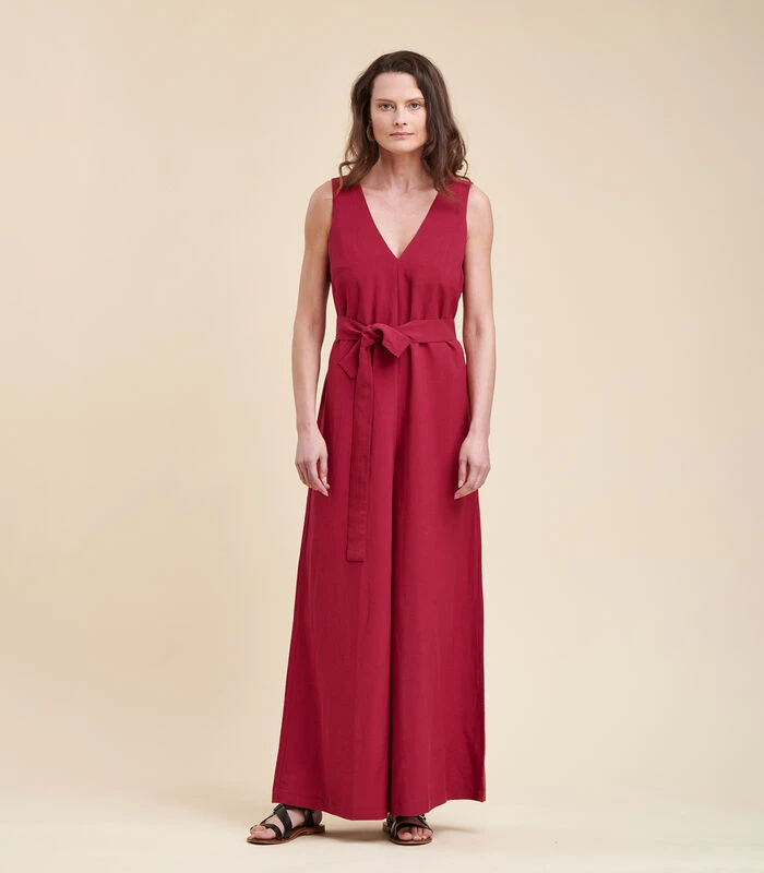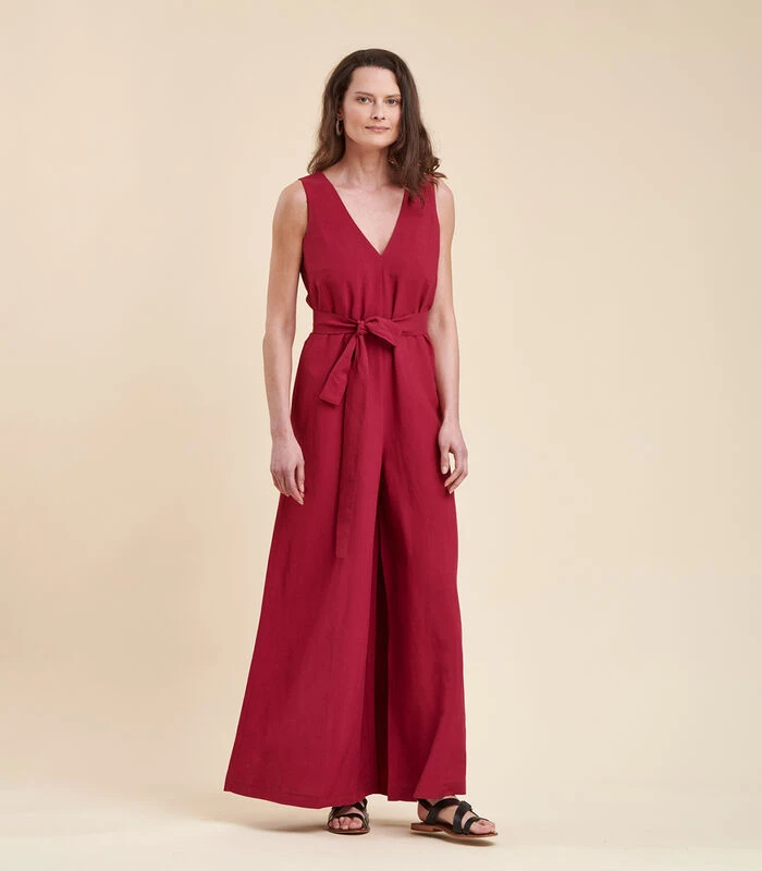 Jumpsuit, V–hals, zonder mouwen, wijde pijpen, rits middenachter, knoopceintuur. 60% Viscose 40% Linnen