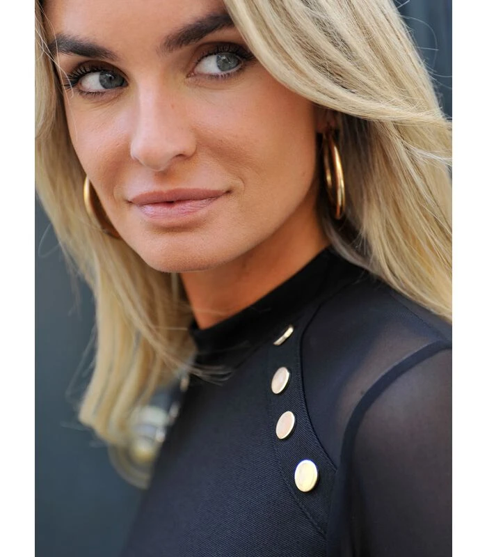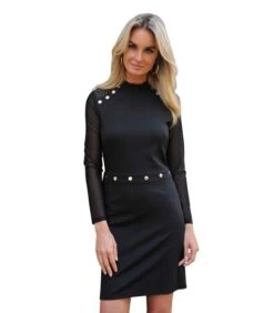 Elegant en tijdloos: de zwarte jurk. De milano stof, de gemarkeerde taille, de visnet inzetstukken en de gouden details maken het tot het perfecte stuk voor uw gelegenheden!
