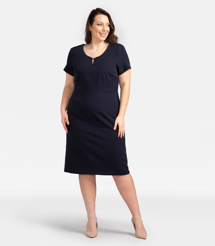 De elegante jurk WILMA is een echte traktatie voor vrouwen die tijdloze modellen met intrigerende details weten te waarderen. Een eenvoudige, nauwsluitende snit en knielengte maken de WILMA perfect voor officiële gelegenheden en garanderen u een professionele uitstraling. Aan de andere kant zullen de indrukwekkende halslijn en rugsplit vrouwelijkheid en buitengewone charme toevoegen aan de hele styling.