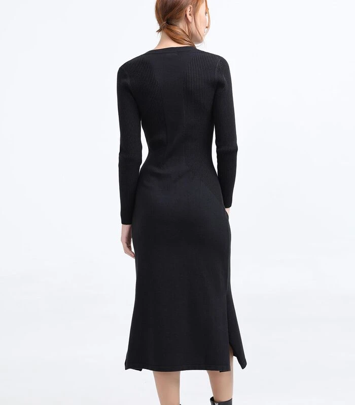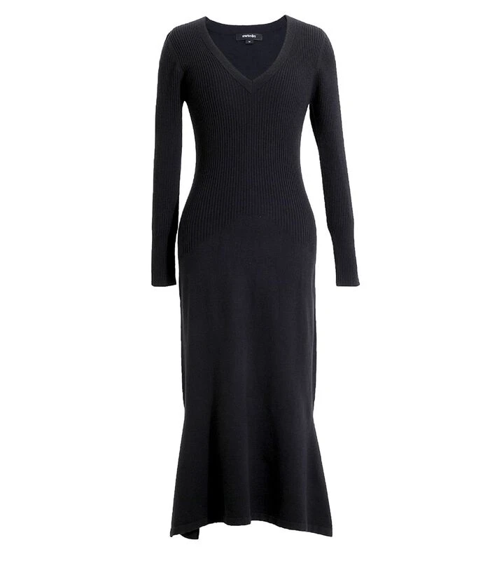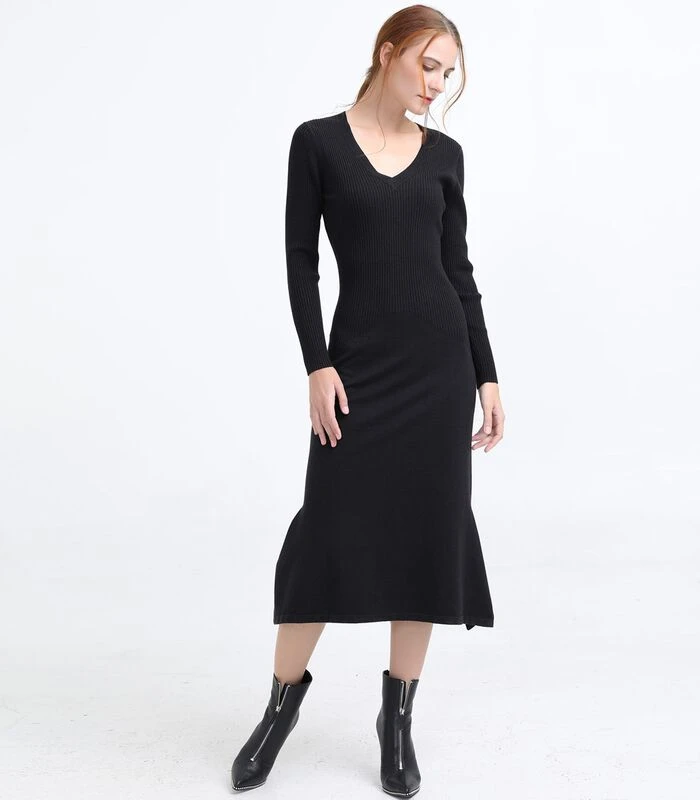 Tijdloos en veelzijdig, geschikt voor zowel lange als slungelige lichaamsbouw. Deze trui is gemaakt van een zacht breisel en dankzij de geribde structuur meer afhangend in de taille en op de heupen. Lange mouwen, V–halslijn, onderaan de rok : uitlopend volume en split aan de zijkanten.
