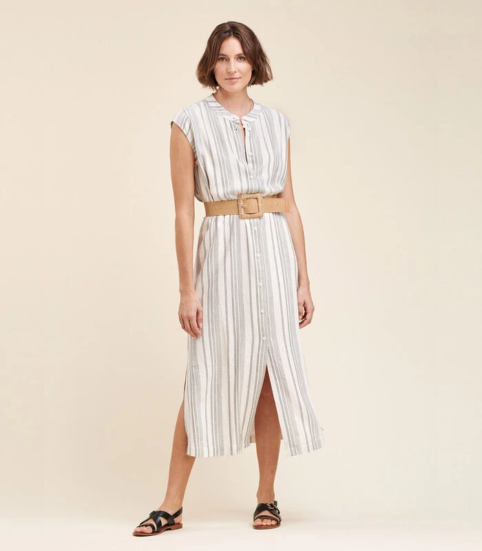 Lange jurk in een fancy gestreepte stof, mao kraag, zeer korte mouwen, zijsplitten. Lengte: 129 cm.Ons model is 1m75 lang en draagt maat 36/S.Dit model heeft een normale maat, neem uw gebruikelijke maat. 91% Viscose 9% Linnen