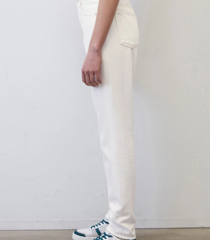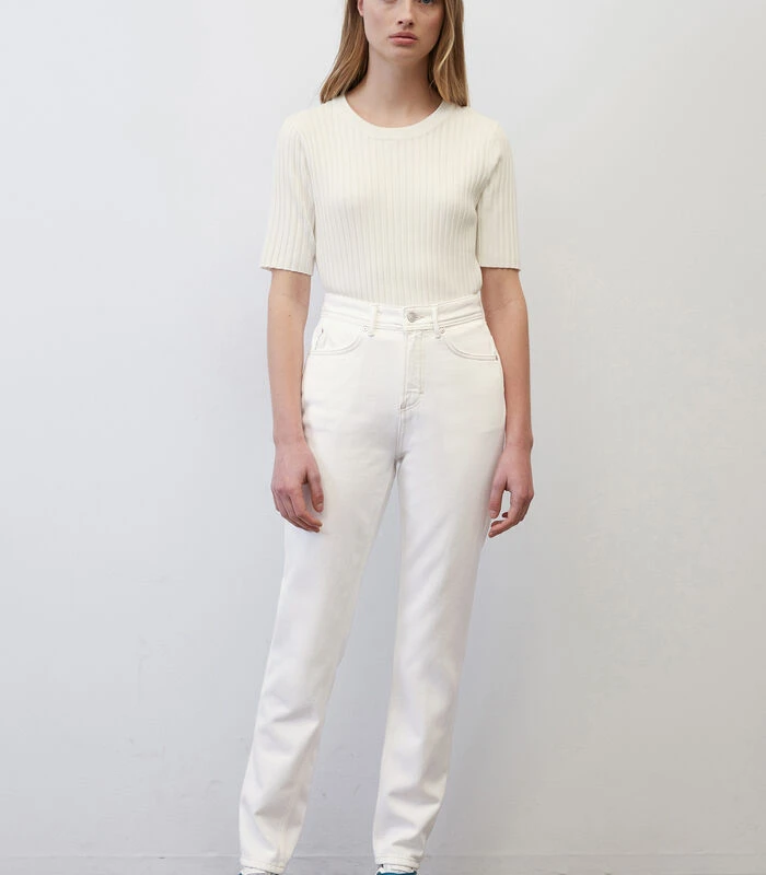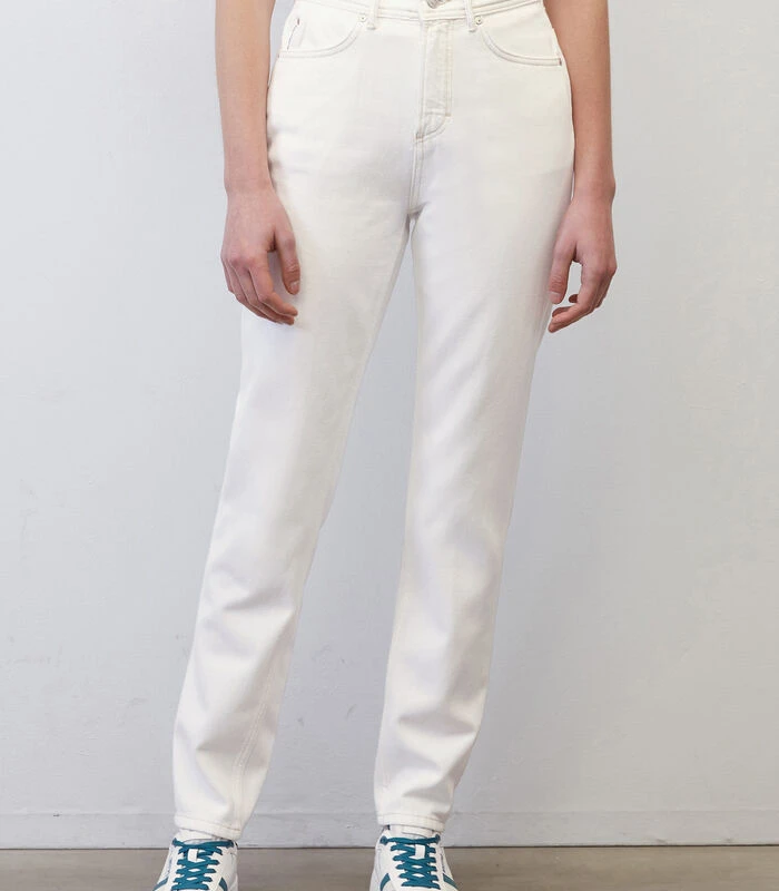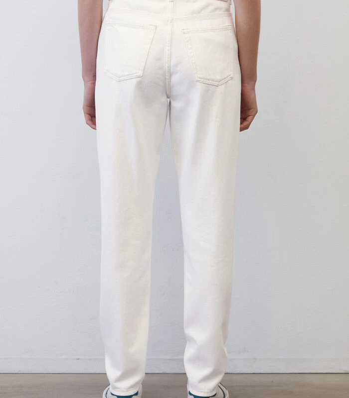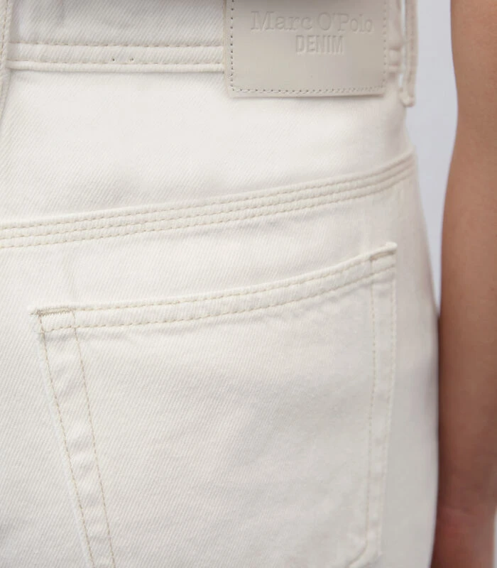 Mom jeans zijn dankzij de hoge taille en de losse pijpen stijlvol en supercomfortabel tegelijk. De jeans – model MAJA Tapered fit – heeft een modern five–pocket–model met normale lengte en een tijdloze witte kleur. Het materiaal: zuiver, gecertificeerd biologisch katoen zonder stretch. Model met contrastkleurige naden en authentieke stud– en knoopdetails. Bijzonder: het innovatieve muntzakje. Tip voor een relaxte kantooroutfit: combineer met een chique blazer en vrouwelijke loafers.