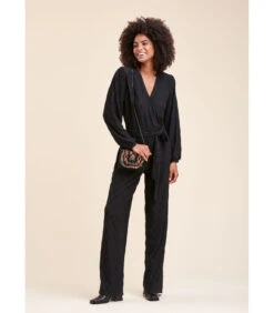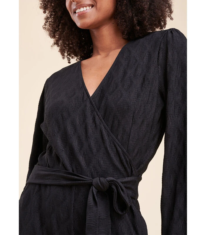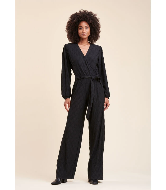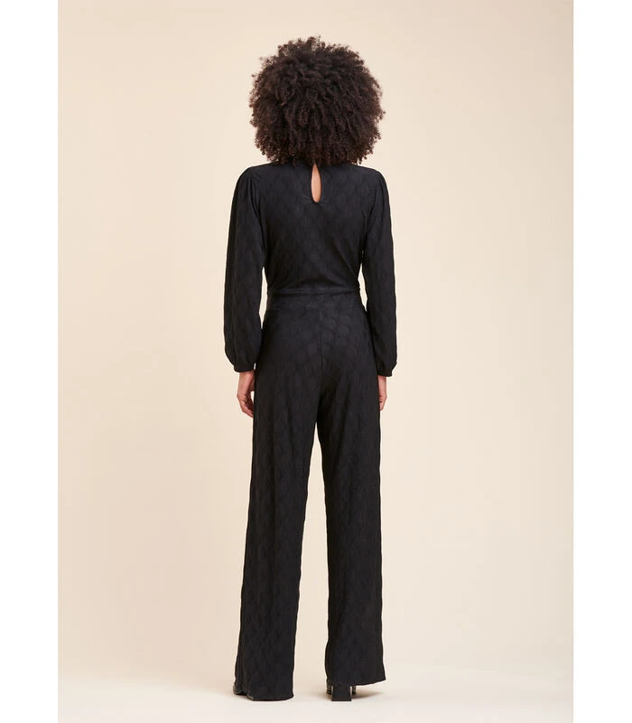 Jersey –combinatie van jersey wuffed, schuilplaats halslijn, lange mouwen met manchetten met knopen, snijgrootte met geknoopte riem, wijd uitlopende broek. Ons model is 1m78 en draagt een maat 36/s. 100% Polyester