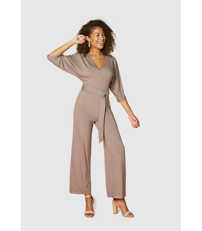 Onze Cara–jumpsuit in wikkel–look heeft een elegante V–halslijn en een afneembare tailleband die individueel geknoopt kan worden om elk figuur te flatteren. De losse pasvorm met kimono–mouwen zorgt voor een vrouwelijke en toch casual look. Met deze tijdloze jumpsuit bent u het hele jaar door goed gekleed, zowel voor alledaagse als speciale gelegenheden.