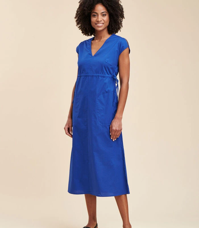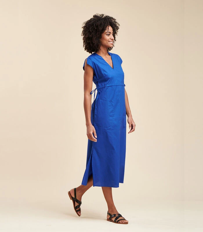 Deze jurk is gemaakt van popeline, V–hals, mouwloos, losjes vallend, met een split in de taille om het silhouet iets te markeren, zakken in de zijnaden. Lengte: 123 cm.Ons model is 1m77 lang en draagt maat 36/S.Dit model heeft een normale maat, neem uw gebruikelijke maat. 97% Katoen 3% Elastaan