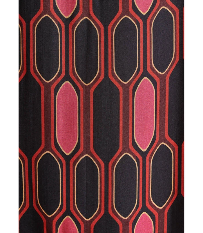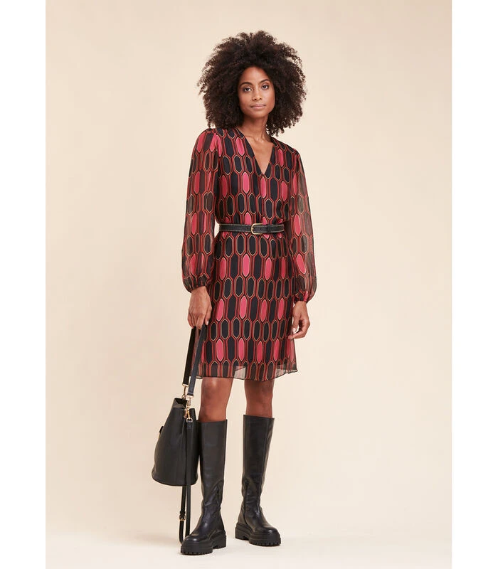 Grote korte jurk in viscose sluier en gedrukte zijde, V –halslijn, lange elastische gezwollen transparante mouwen, gevoerde jurk. Lengte: 99 cm. Ons model meet 1m78 en heeft een maat 36/s. 70% Viscose 30% Zijde Voering: 100% Viscose