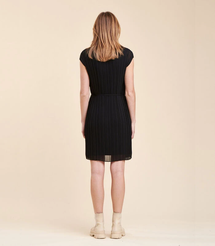 Korte getailleerde jurk van geplooide polyester voile, V–hals met biais afwerking, korte vallende mouwen, dunne strikbandjes, jersey voering. Lengte: 90 cm.Ons model is 1m77 lang en draagt maat 36/S.Dit model is getailleerd gedragen, neem een maat boven uw gebruikelijke maat voor een meer casual wear. 100% Polyester
