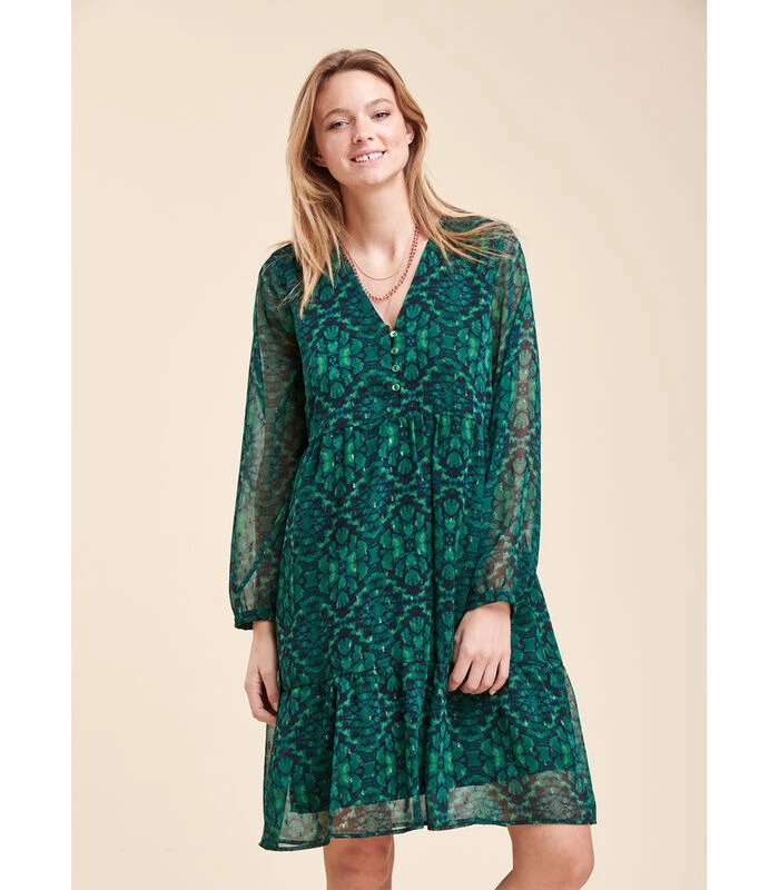 Korte jurk in das gedrukt polyester & amp; Kleurstof met metalen gesneden draden, halslijn V geknoopt, lange mouwen met armbanden met knopen, maat gesneden met verzameld, lage kleding stuurwiel met verzamelde, wijd uitlopende jurk, gevoerde jurk. Lengte: 98 cm. Ons model meet 1m75 en heeft een maat 36/s. 99% Polyester 1% Metaalvezels Voering: 100% Viscose