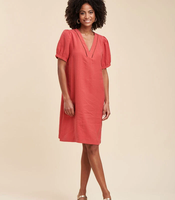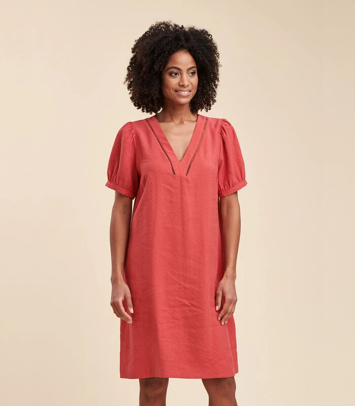 Korte jurk, korte pofmouwen, V–hals met laddervlecht, recht model. Dit is een ecologisch verantwoord model in een Modal stof. Lengte: 95 cm.Ons model is 1m77 lang en draagt maat 36/S.Dit model heeft een normale maat, dus neem uw gebruikelijke maat. 87% Modal 13% Polyester