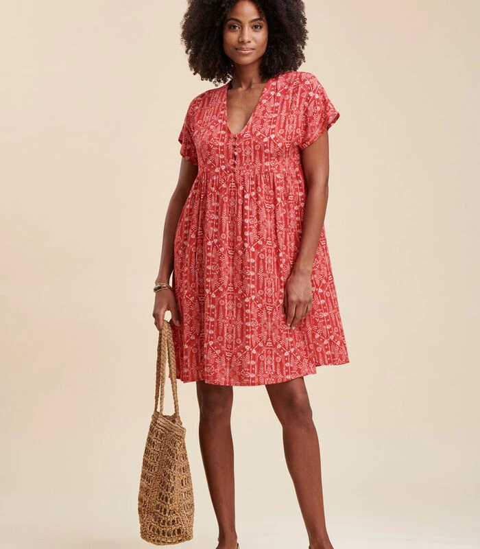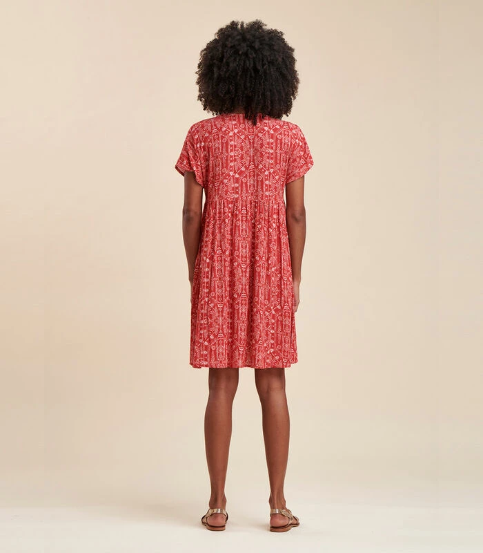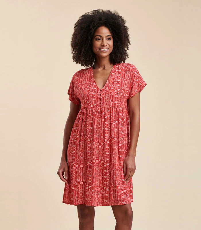 Dit is een korte, ruimvallende, bedrukte jurk met een V–hals en vier knopen, korte vallende mouwen en een uitsnede onder de buste met plooien. Lengte: 95 cm.Ons model is 1m77 lang en draagt maat 36/S.Dit model is oversized gedragen, neem een maat kleiner voor een meer getailleerde look. 100% Viscose