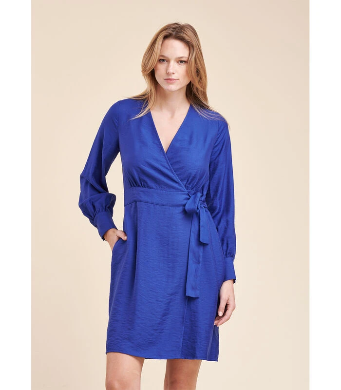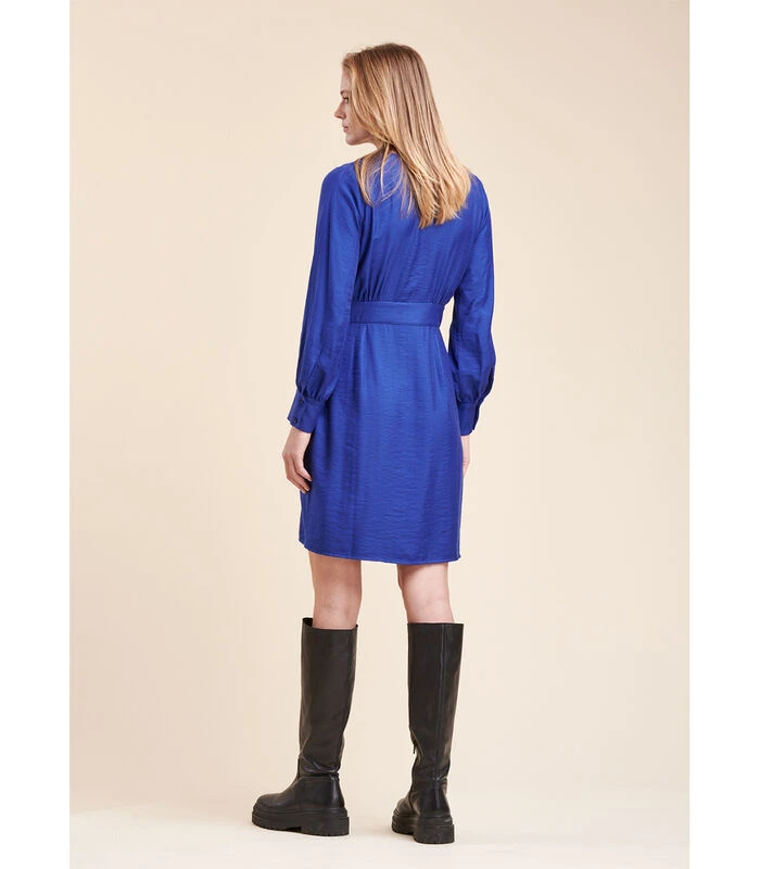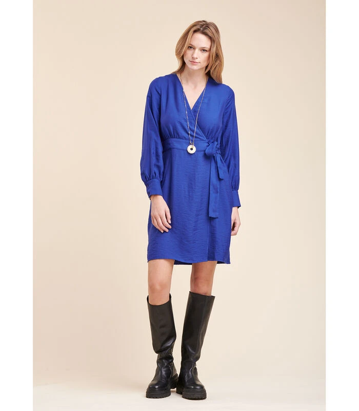 Korte portfolio โjurk, lange mouwen met grote polsen en verzamelingen, snijgrootte met klein paneel, zakken in het naaien, riem om te binden. Lengte: 95 cm. Ons model meet 1m75 en heeft een maat 36/s. 85% Viscose 15% Polyamide