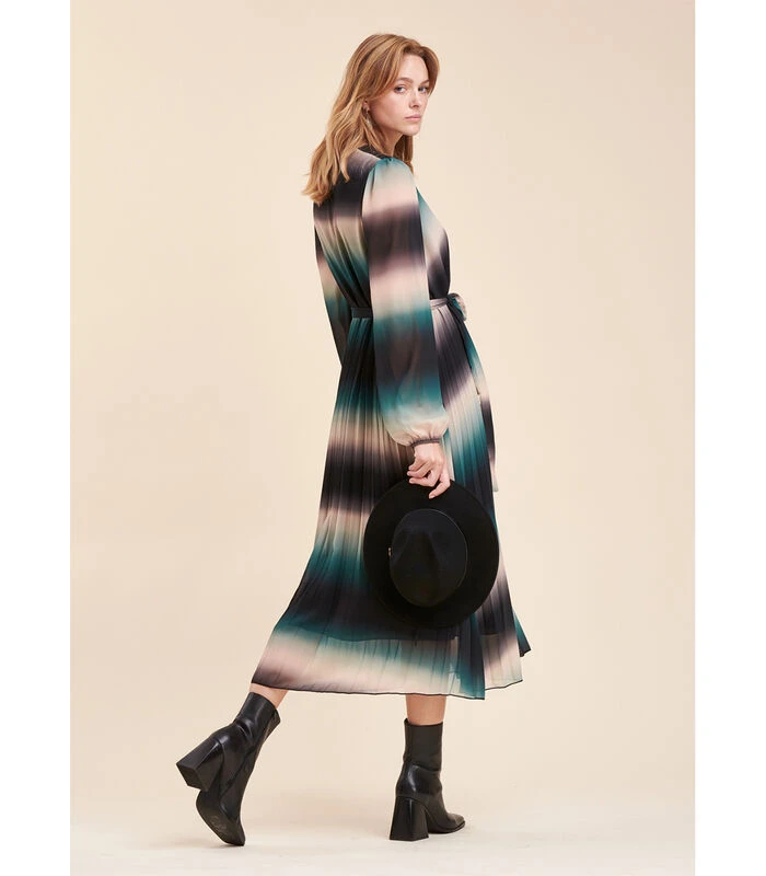 Lange geplooide jurk in das gedrukt polyester & amp; Kleurstof, cachehurkenhok, lange elastische puffmouwen, maat gesneden met geknoopte riem, geplooide wijd uitlopende rok, gevoerde jurk. Lengte: 127 cm. 100% Polyester