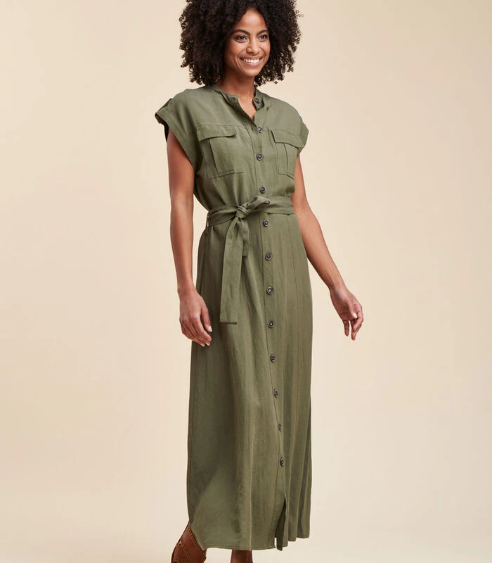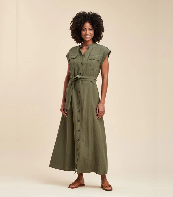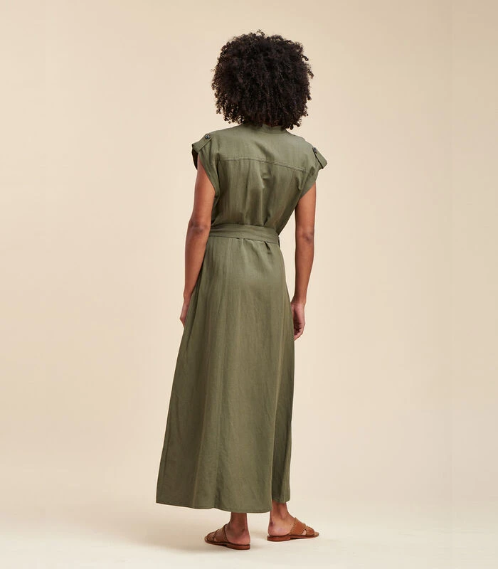 Mouwloze lange jurk, geknoopt middenvoor, kleine mao kraag, afneembare riem om in de taille te strikken. Lengte: 139 cm.Ons model is 1m77 lang en draagt maat 36/S.Dit model heeft een normale maat, neem uw gebruikelijke maat. 60% Viscose 40% Linnen