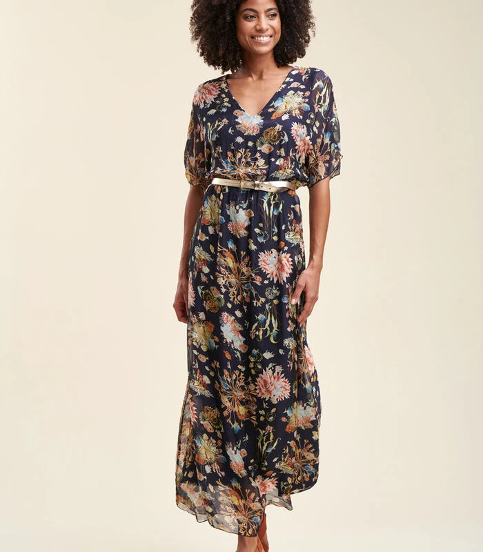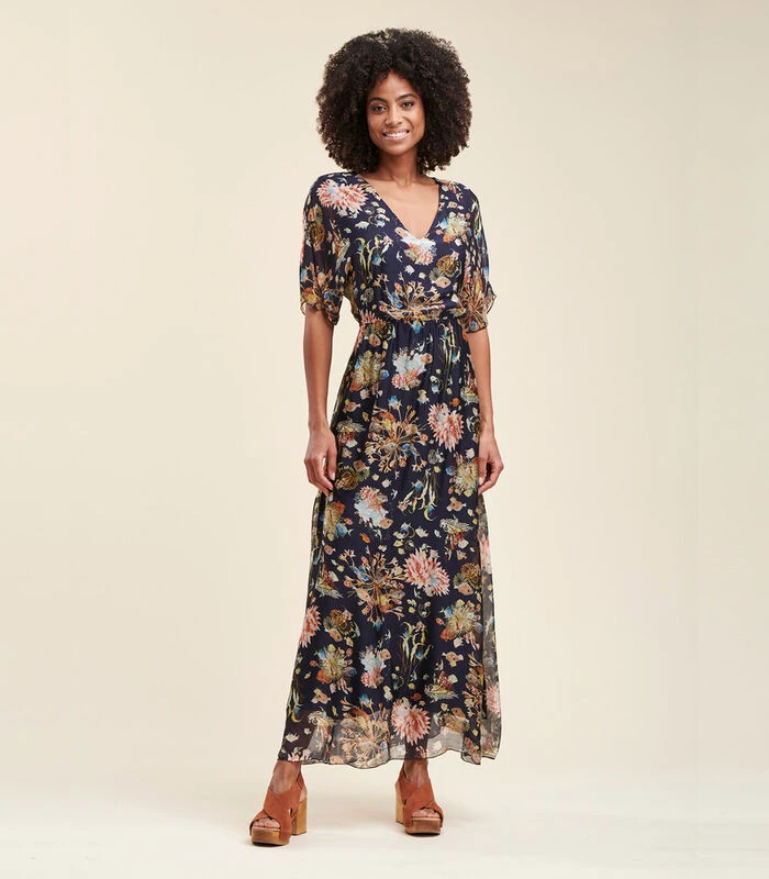 Lange jurk van viscose zijde voile met vef print, V hals, 3/4 mouwen, elastische taille, jersey voering. Lengte: 142 cm.Ons model is 1m77 lang en draagt maat 36/S.Dit model heeft een normale maat, neem uw gebruikelijke maat. 70% Viscose 30% Zijde Voering: 95% Viscose 5% Elastaan