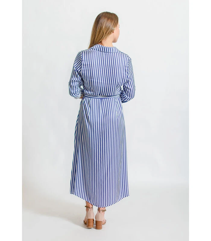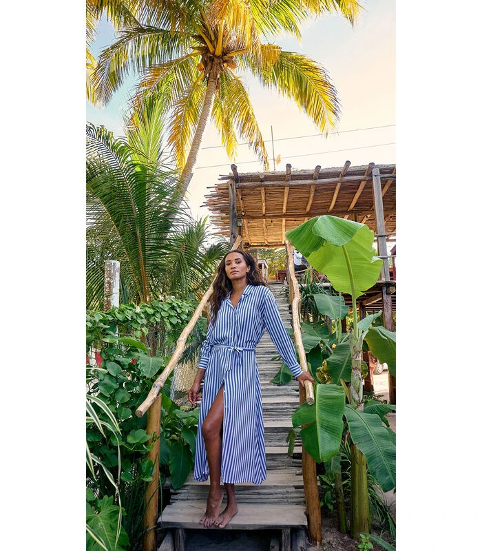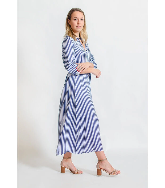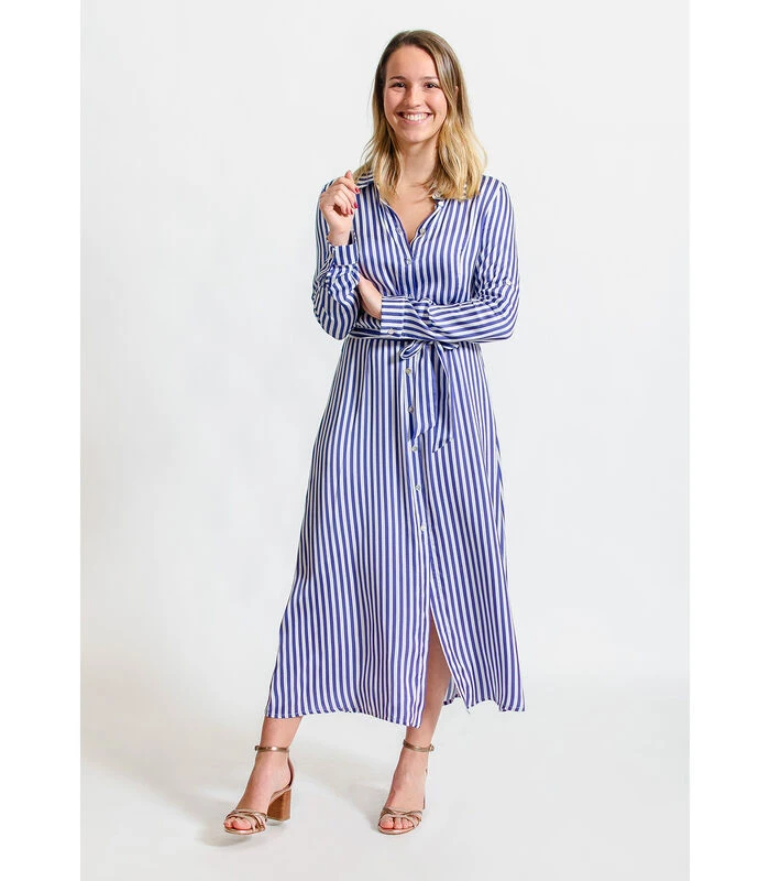 Elegant en modern, deze lange lijn met marineblauw en wit draagt het hele seizoen en bij alle gelegenheden. Ze heeft een shirt kraag, knopen en een riem in de taille. Vrouw, comfortabel en aangenaam om te dragen, het is een van die tijdloze kleding die het onmogelijk is om moe te worden.