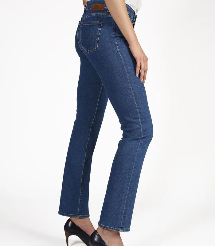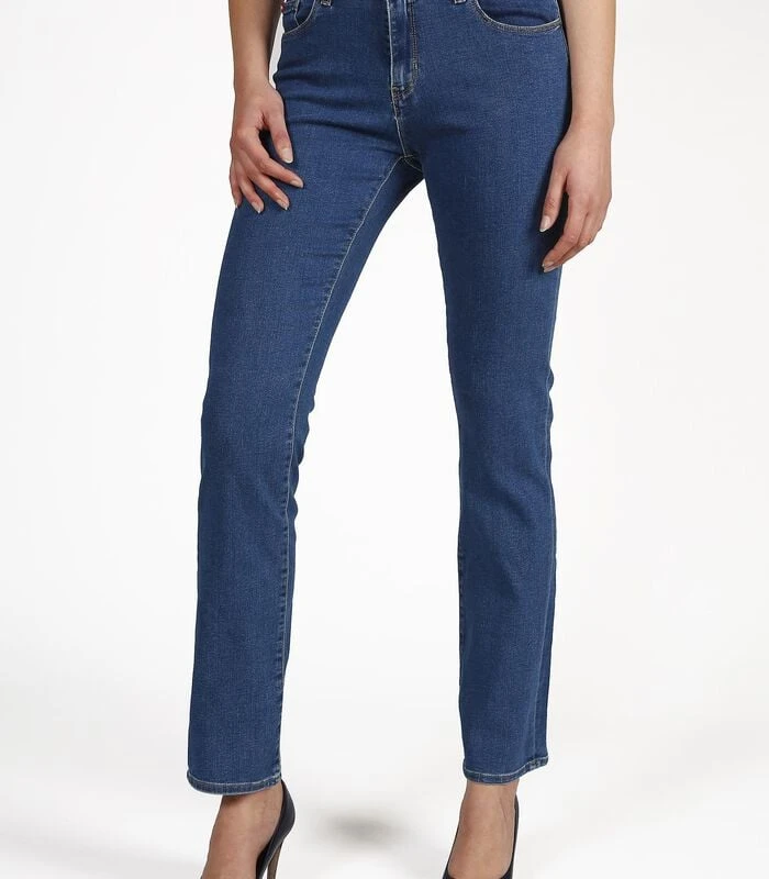 De KARA is een nieuwe rechte fit met een hoge taille.De Myrall stone is een egale blauwe wassing.