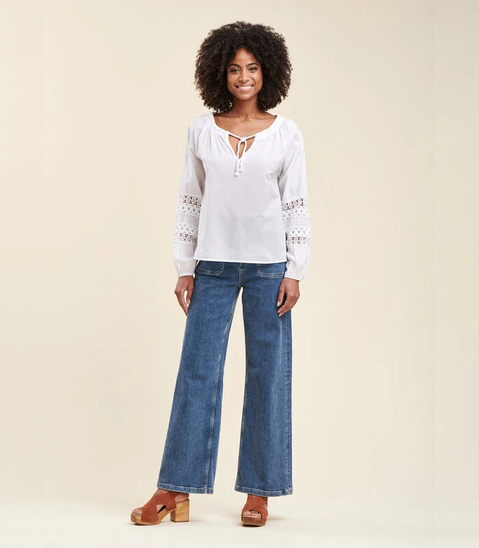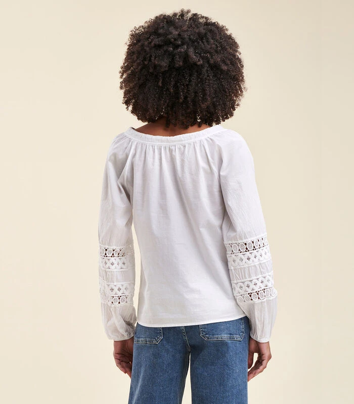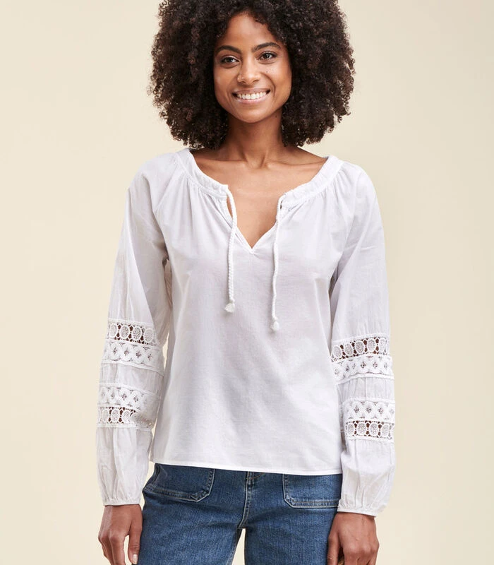 Een ruimvallende katoenen voile top met een tunische halslijn en striksluitingen, lange elastische raglanmouwen met kanten inzetstukken.Het model is 1m77 en draagt maat 36/S.Dit model is ruimvallend, neem een maat kleiner dan uw gebruikelijke maat voor een meer getailleerde pasvorm. 100% Katoen