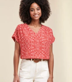 Deze top heeft een V–hals, korte mouwen, ruches op de schouders en een ruguitsnijding met ruches. Ons model is 1m77 en draagt maat 36/S. Deze top is oversized, dus neem een maat kleiner voor een meer getailleerde pasvorm. 100% Viscose