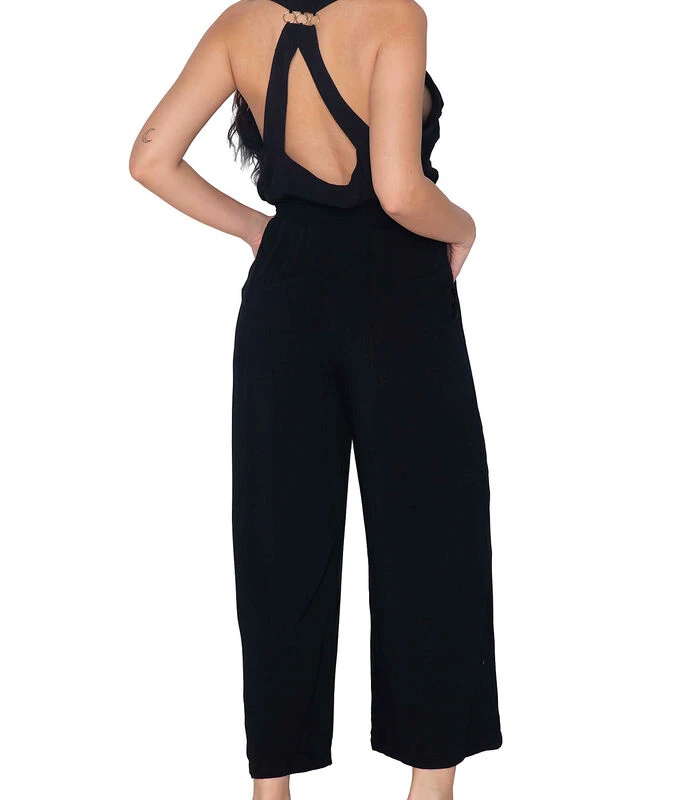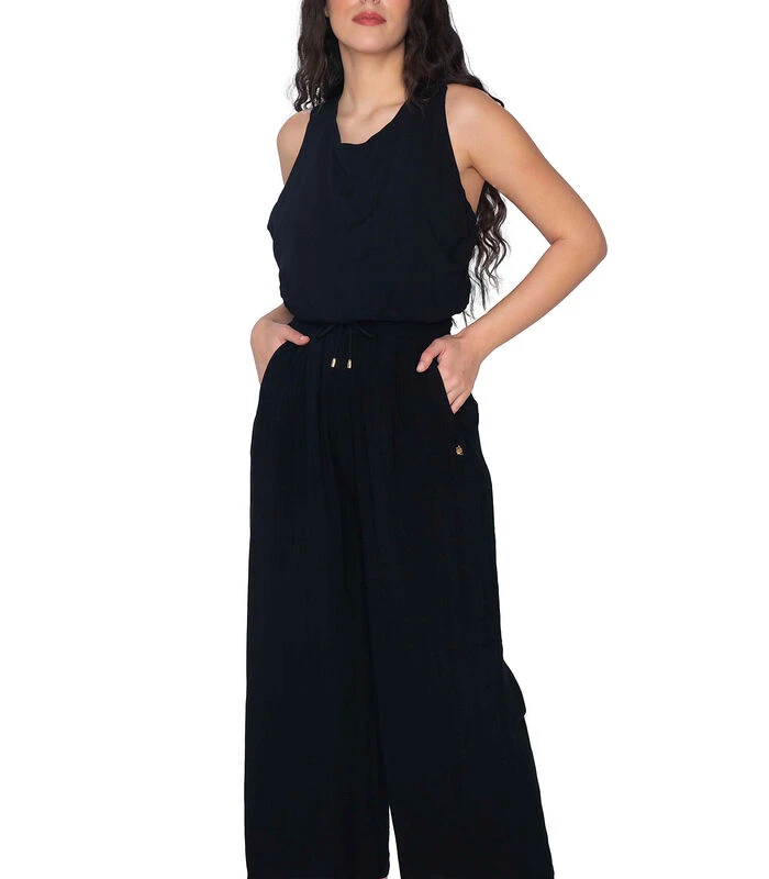 Luchtig broekpak ideaal om te dragen tijdens uw zomervakantie, op het strand of voor al uw zomerse uitstapjes. Het is een frisse en zeer elegante outfit, geschikt voor elk moment van de dag. Gemaakt van zachte en lichte viscose, is het zeer comfortabel om te dragen. Met een elastische tailleband om het lichaam te flatteren en het figuur te versterken, sluit het bij de hals met discrete knopen. De rug wordt benadrukt door een opening en brede gekruiste banden met gouden ringdetails.[Jumpsuit wordt apart verkocht. Sieraden en andere accessoires die het model op de foto’s draagt, zijn niet inbegrepen].