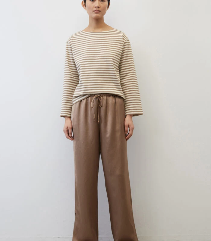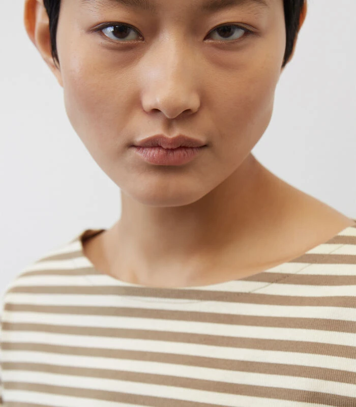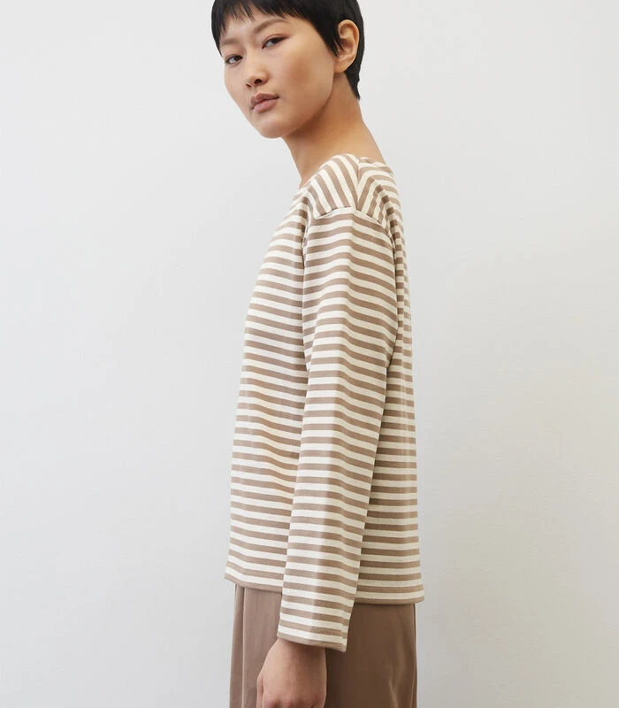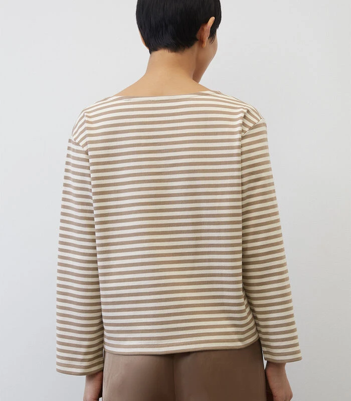 Deze longsleeve combineert meerdere eigenschappen van basic trends in slechts één item. Het heeft een tijdloos, klassiek streepmotief. Het is gemaakt van heavy jersey met een gemiddeld gewicht van hoogwaardig, zuiver organic cotton. Het heeft een wijde, vrouwelijke boothals. Het heeft oversized schouders. Het heeft wijde, extra lange mouwen en een losjes vallende, comfortabele en subtiel kortere fit. Combineer voor een spannende look met edgy items zoals een leren jack.