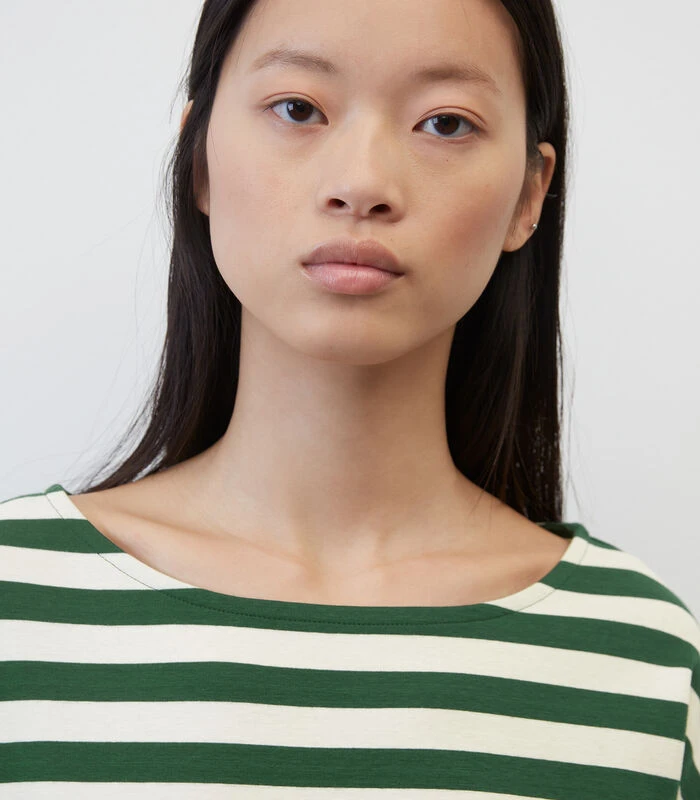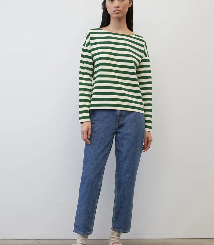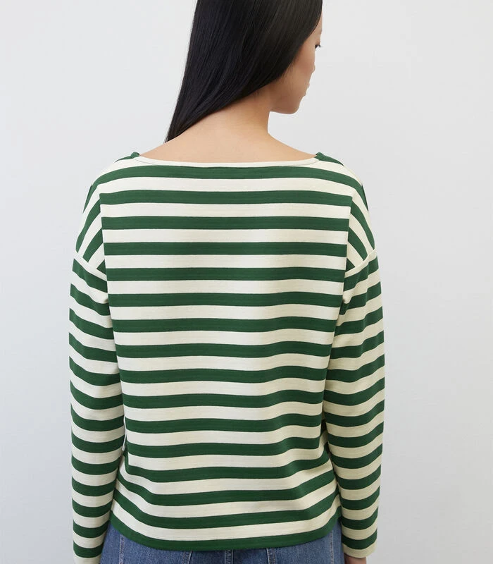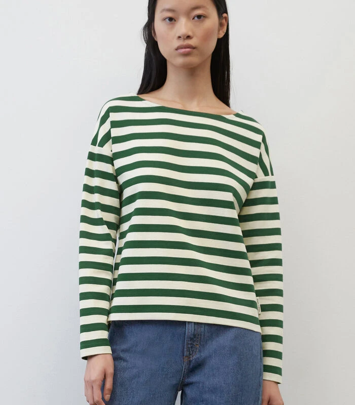 Een blijvertje: gestreepte Tโshirts. Een blijvende trend is zachte en compacte interlockโjersey van een elastische mix van biologisch katoen van geverfde garens. Casual fit met een wijde hals, duidelijk oversized schouders en rechte zomen. Het casual shirt zorgt voor een vleugje Franse chic in dagelijkse looks en heeft een maritieme uitstraling. Mooi bij de klassieke slim fitโjeans โ steek hem casual aan de voorkant in de broeksband.