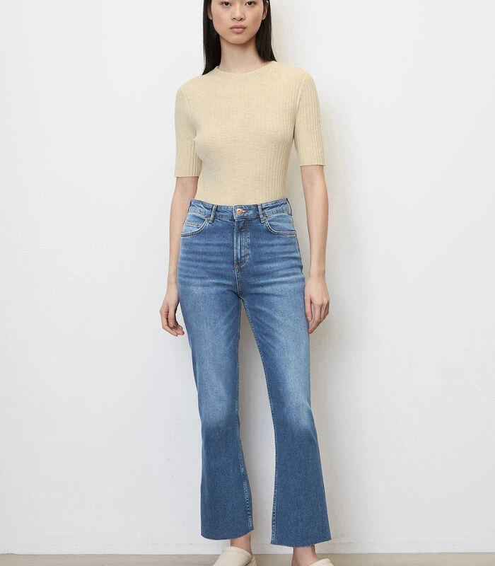 Met veel overtuigingskracht: supercasual, nieuwe jeans model AHUS van een mix van authentiek sustainable denim met elastaan van een elastische mix met biologisch katoen. De broek heeft een cool retromodel met hoge taille, klassieke five–pocket–details en coole kortere en uitlopende pijpen. Kenmerkend voor broeken met uitlopende pijpen – deze modellen zorgen voor een elegante en sportieve look en passen bij een lichte coltrui, een oversized blazer, een T–shirt, top of een blouse met opvallende mouwen. Uniek: de zoom is niet opengestreken, maar onafgewerkt en rafelig.