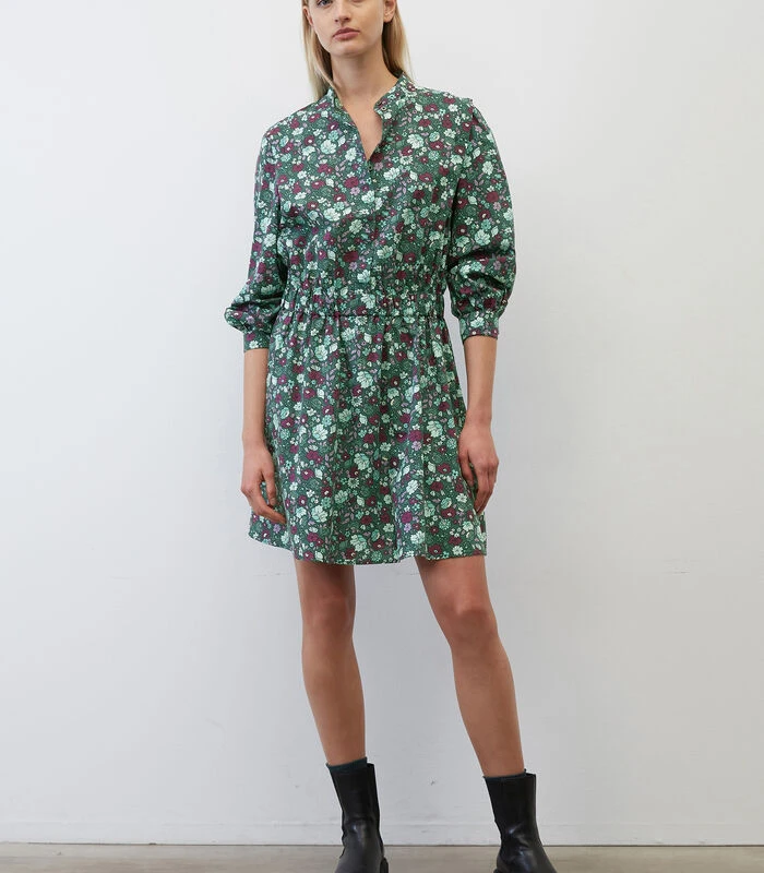 Opvallende mouwen, geaccentueerde schouders in de stijl van de jaren 80 en een in het oog springende, vrolijke, lenteachtige print all–over – dat zijn de belangrijkste kenmerken van deze casual, korte jurk van een zachte, hoogwaardige mix van katoen en lyocell. Het ruimvallende model heeft een opstaande kraag, een blinde halve knoopsluiting, een comfortabele elastische taille, mouwen met opvallend gerimpelde, brede manchetten en een uitlopende, subtiel gewelfde zoom. Voor een supermoderne look: combineer met een ondoorzichtige panty en stoere chunky boots. Valt groot uit – bestel a.u.b. een maat kleiner voor een shaped fit.