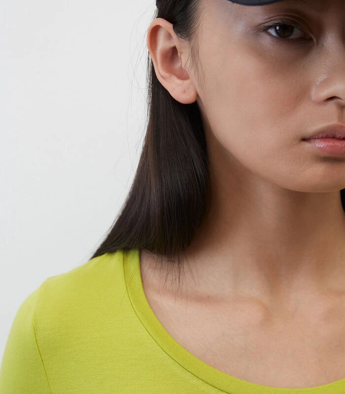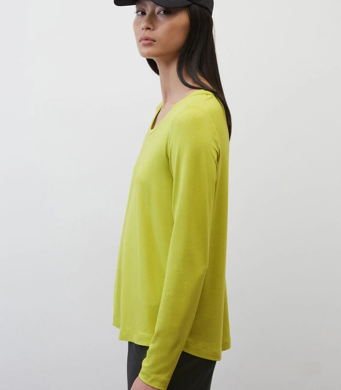 Goed nieuws: de longsleeve is terug van weggeweest. Vaarwel blote armen – welkom ‘aangeklede’ look! Perfecte combi: jeans, sneakers en longsleeve. Ons model is gemaakt van zachte, fijne jersey van viscose met stretch en heeft een subtiele, stijlvolle glans. Relaxed fit met wijde, ronde hals, lange mouwen en een enigszins afgeronde zoom.