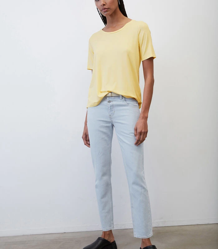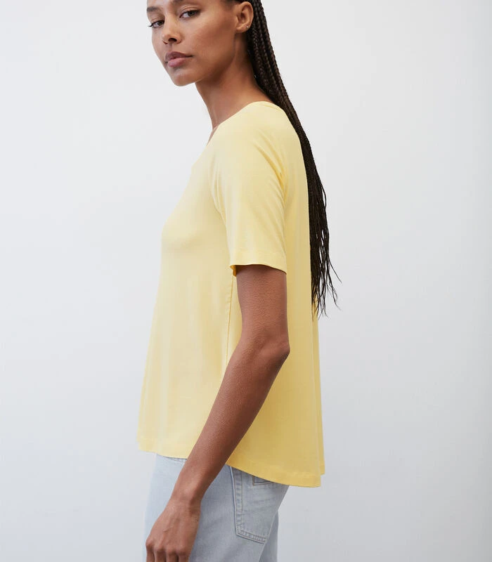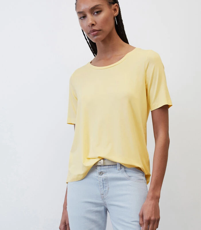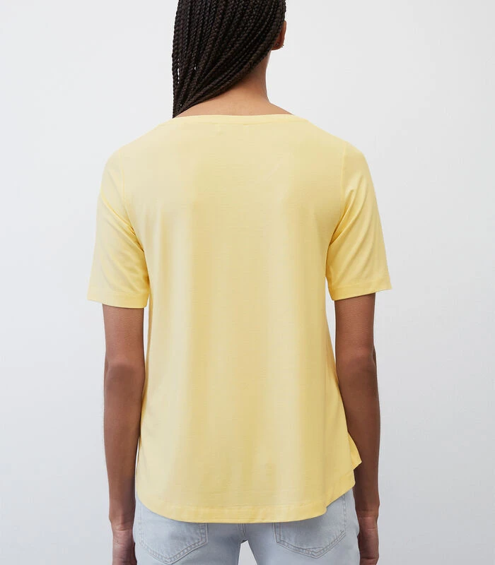 Superzacht, heerlijk licht, vrouwelijk en soepel: losjes vallend T–shirt met wijde ronde hals en smalle, fijn geribde rand. Met halflange mouwen, langer achterpand en licht gewelfde zoom. Het materiaal: hoogwaardige, elastische jersey van viscose met elastaan. Dit T–shirt is uitermate geschikt om ergens onder te dragen, maar kan ook zelfbewust solo worden gedragen.