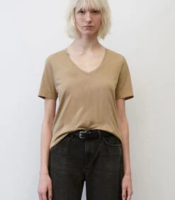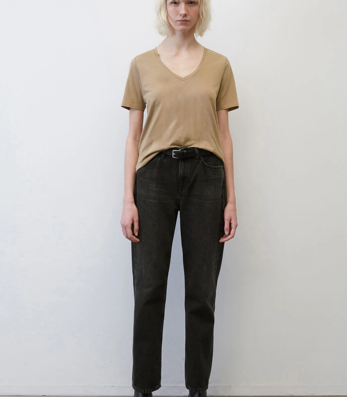 Minimalistisch, Scandinavisch, met een vrouwelijke charme en de perfecte mix van cool, chic en sportief: casual T–shirt van zuiver, GOTS–gecertificeerd organic cotton. Losse regular fit met een lage V–hals, korte mouwen en een klassieke zoom. Modern, tijdloos, uitermate stijlvol model dat veelzijdig te combineren is.