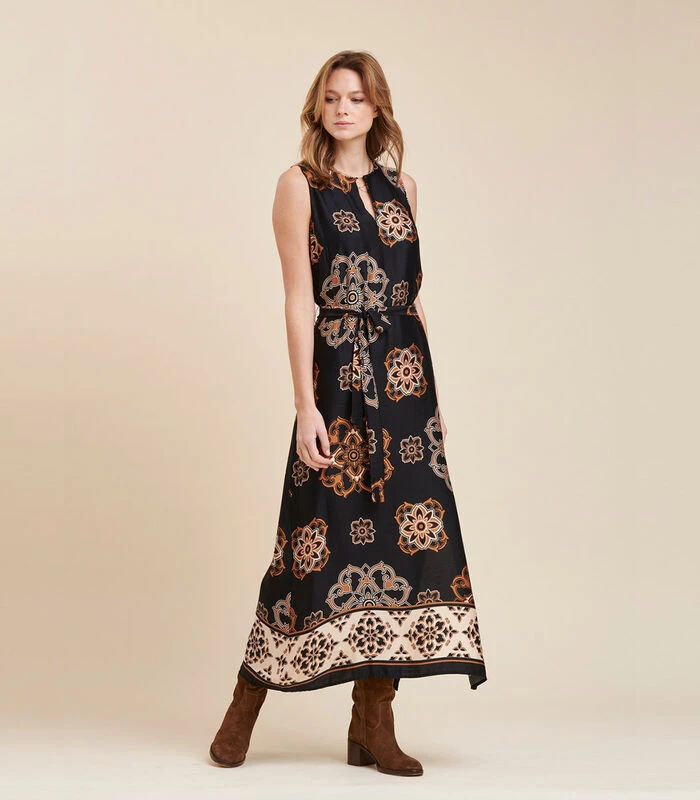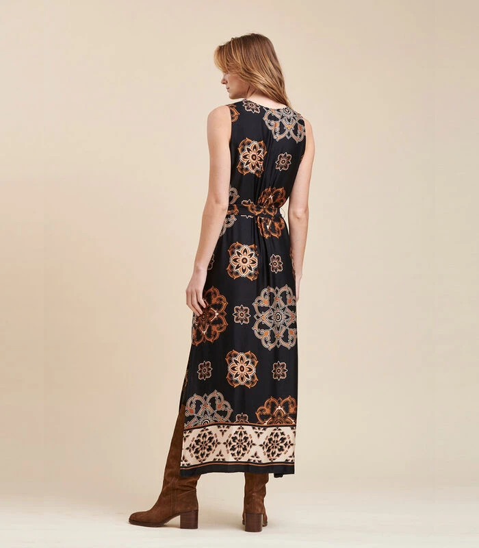 Losvallende lange jurk met etnische print onderaan, ronde halslijn met knoopsluiting, mouwloos, bindceintuur, zijsplitten. Lengte: 139cm.Het model is 1.90m en draagt maat 36/S.Dit model heeft een normale maat, neem uw gebruikelijke maat. 100% Viscose