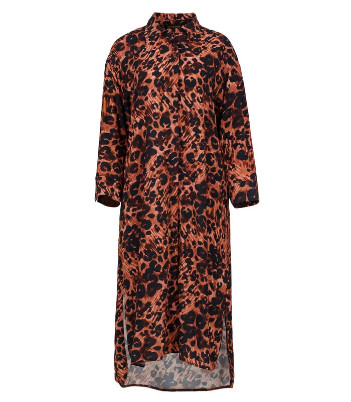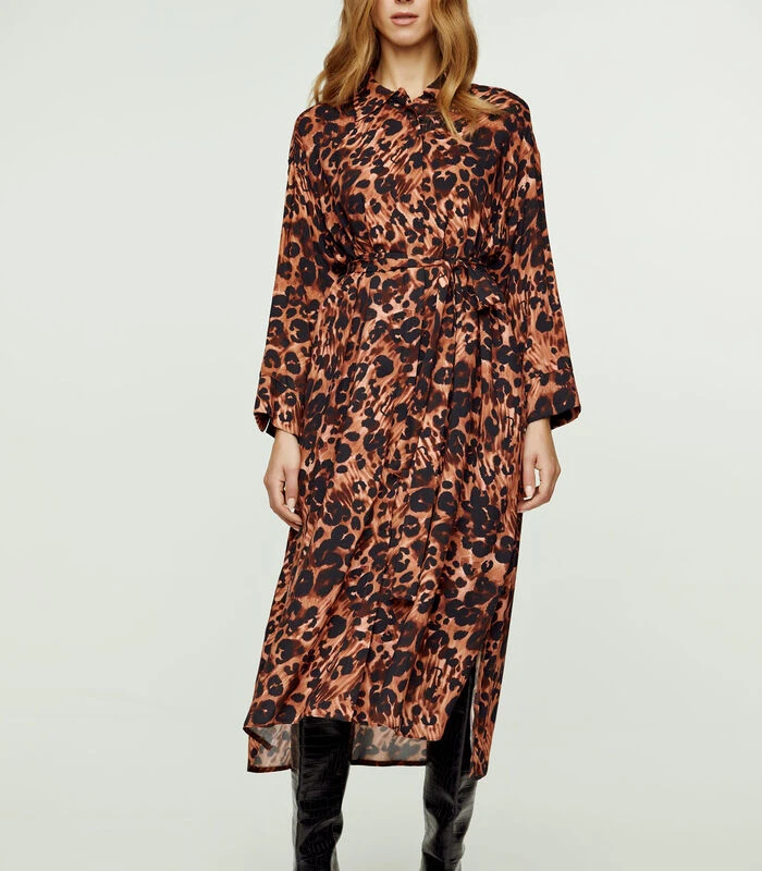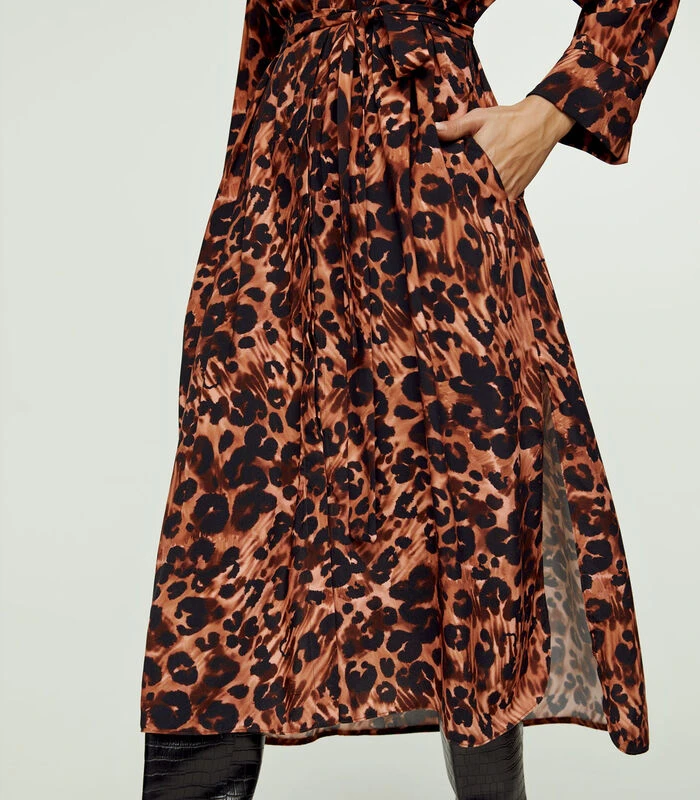 Deze midiโjurk met dierenprint is gemaakt van geweven viscose. Het heeft een kraag en een blinde sluiting die vooraan met plastic knopen wordt gesloten. De mouwen zijn 7/8 lang met manchetten in dezelfde stof en splitjes aan de uiteinden. De jurk heeft hangende schouders. Er is een optionele ceintuur in dezelfde stof. De zoom is afgerond met lange splitten van 40 cm aan de zijkanten.
