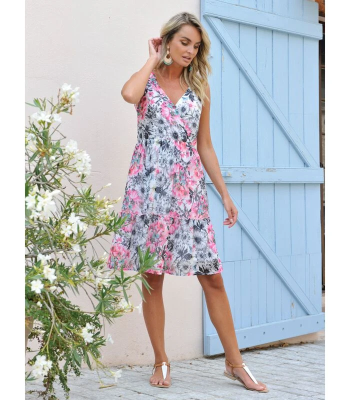 Deze visnetjurk valt op door de Japanse print in roze tinten. De ruches op de rok geven het volume en een zeer vrouwelijke touch.