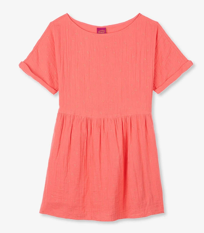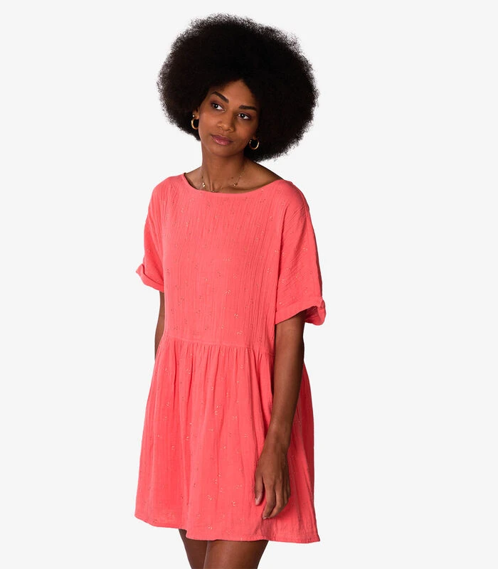 โข Oversized snit, korte mouwen, een ronde hals, gouden allโoverbedrukking