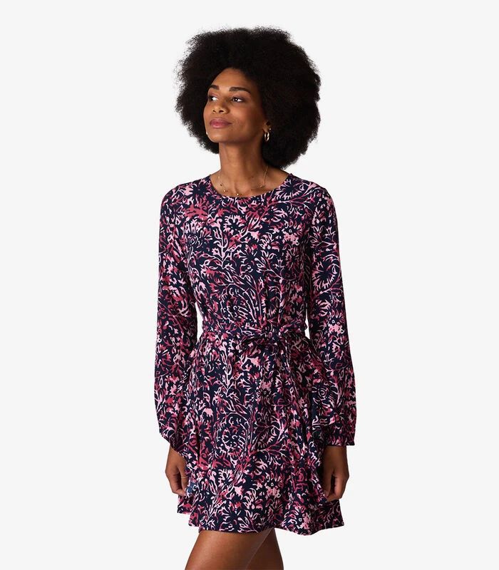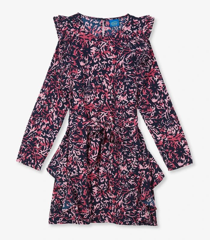 • Jurk met volants en all–overprint, korte en rechte snit, lange mouwen, ronde hals, assorti striklint vooraan geknoopt