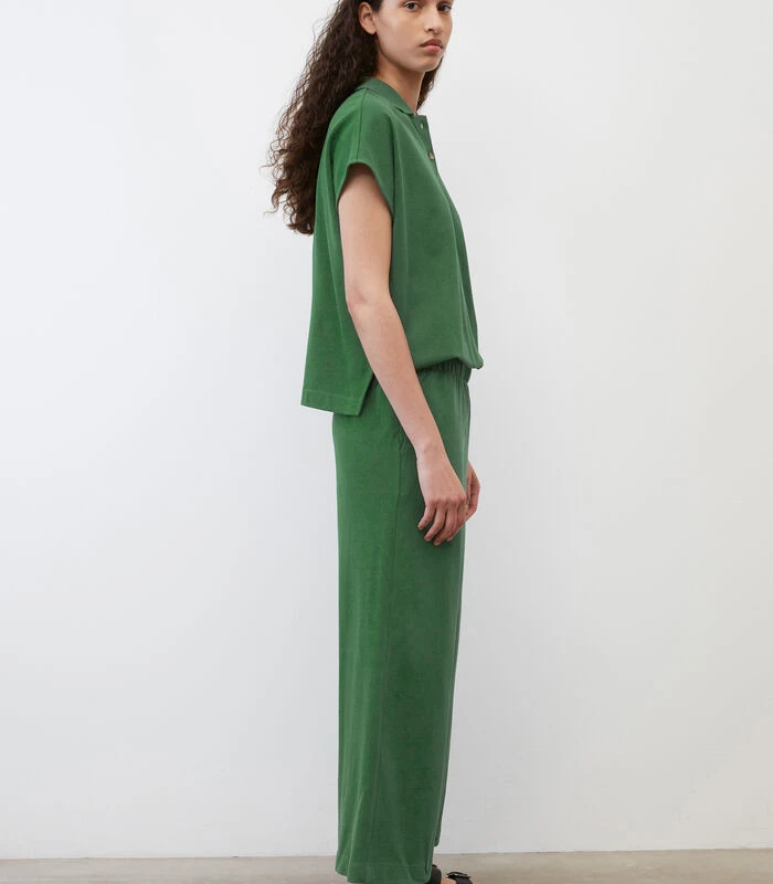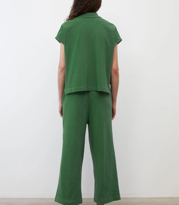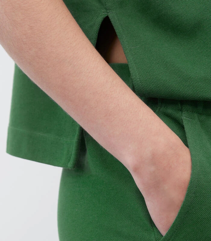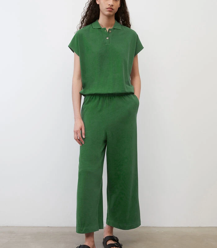 Jump in! Met deze casual, minimalistische jumpsuit creëert u ‘s ochtends in een handomdraai een moderne en geklede look. Model in de stijl van een poloshirt van klassiek jersey–piqué van zuiver biologisch katoen. Losjes vallende, comfortabele fit met plat gebreide kraag, korte knoopsluiting, aangeknipte mouwtjes en elastische taille. De broek heeft een rechte fit en twee handige, schuine steekzakken op de voorkant. Het verrassende achterpand zorgt voor een casual twee–in–één–look.