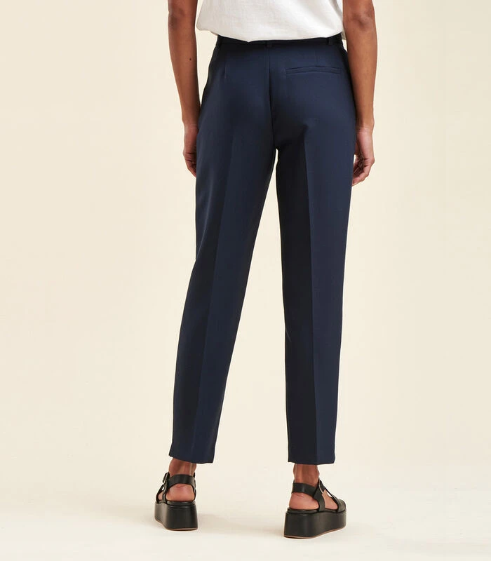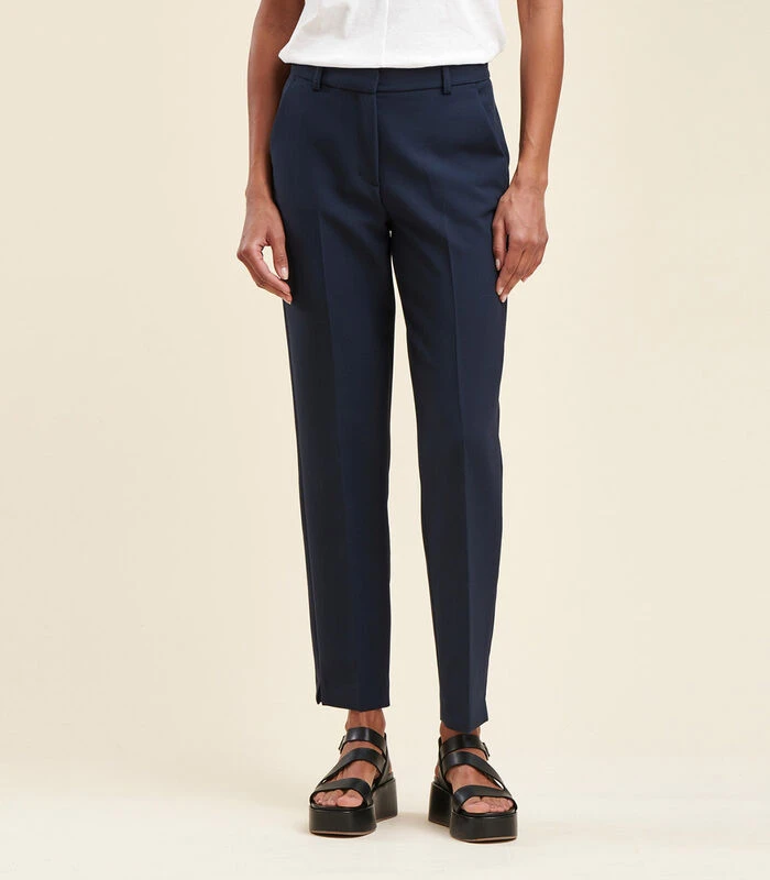 Sigarettenbroek van gerecycled polyester, 7/8e lengte, mid–rise taille, haak– en oogsluiting en verborgen knoop onder placket. Gulp met rits. Italiaanse zakken (op de zijkant). Ecologisch verantwoord model van gerecycled polyester. RCS EGL/252903.Ons model is 1m77 lang en draagt maat 36/S.Dit model past normaal, neem uw gebruikelijke maat. 37% Gerecycled Polyester 36% Polyester 20% Viscose 7% Elastaan Voering: 100% Polyester