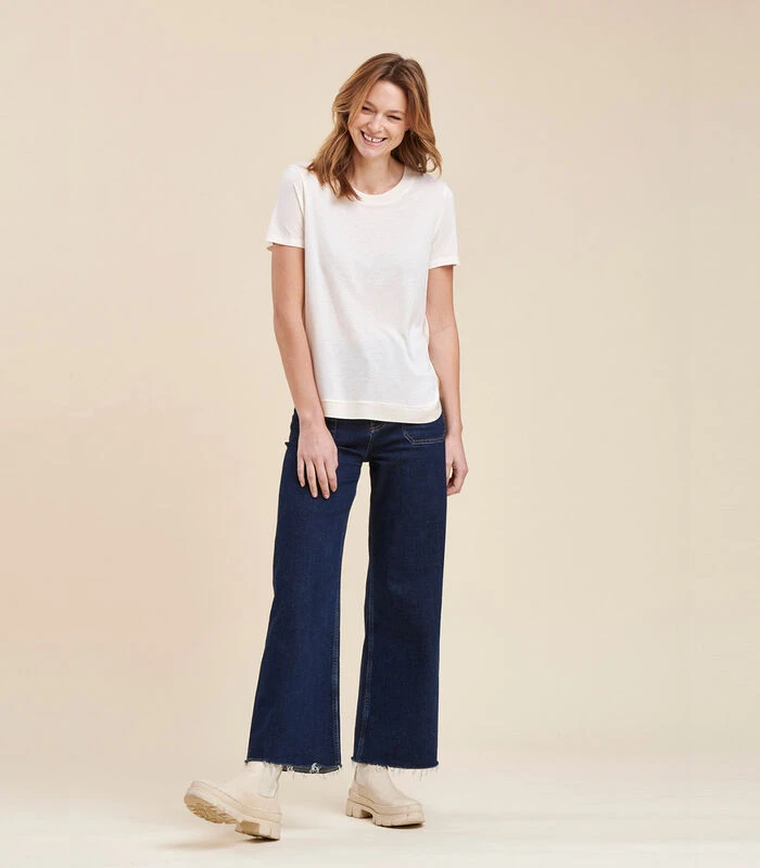 Dit is een ruimvallend T–shirt met een ronde halslijn, korte mouwen en geribde details rond de halslijn en aan de onderkant van het kledingstuk.Ons model is 1m75 lang en draagt maat 36/S.Dit is een ruimvallend T–shirt, neem een maat kleiner dan uw gebruikelijke maat voor een meer getailleerde pasvorm. 100% Viscose