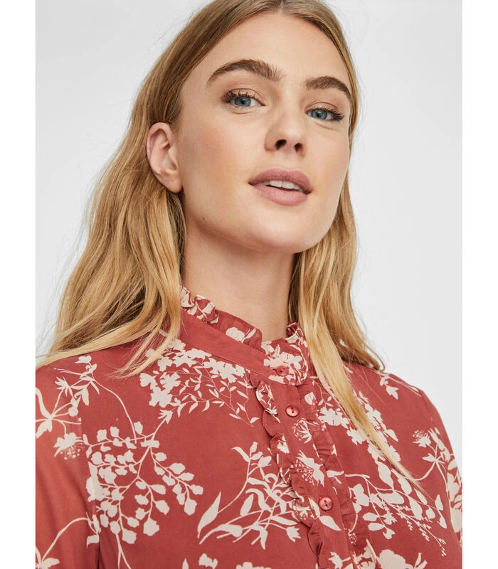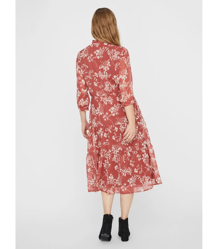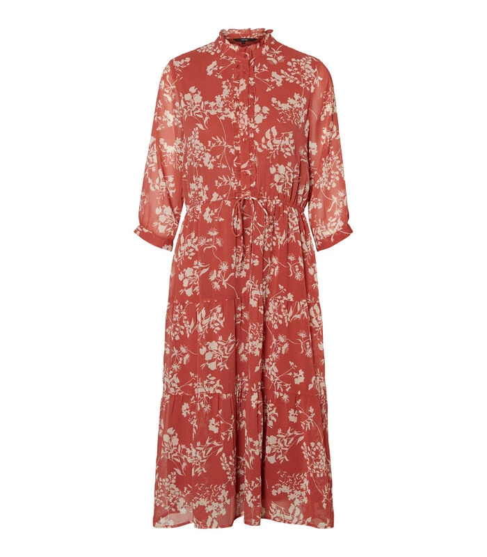 – Bedrukte midi–jurk – Regular fit – Zacht en licht materiaal – Hoge kraag met ruches details – Knopen en ruches aan de voorkant – Lengte: 116 cm in maat S – Model meet 177 cm en draagt een maat S. Bedrukte midi–jurk met hoge kraag en ruches details. De jurk heeft knopen en ruches aan de voorkant. Stijl de jurk met hoge hakken voor een mooie avondjurk.