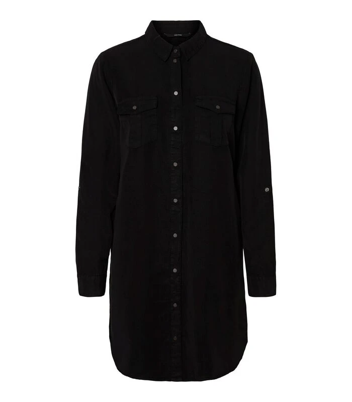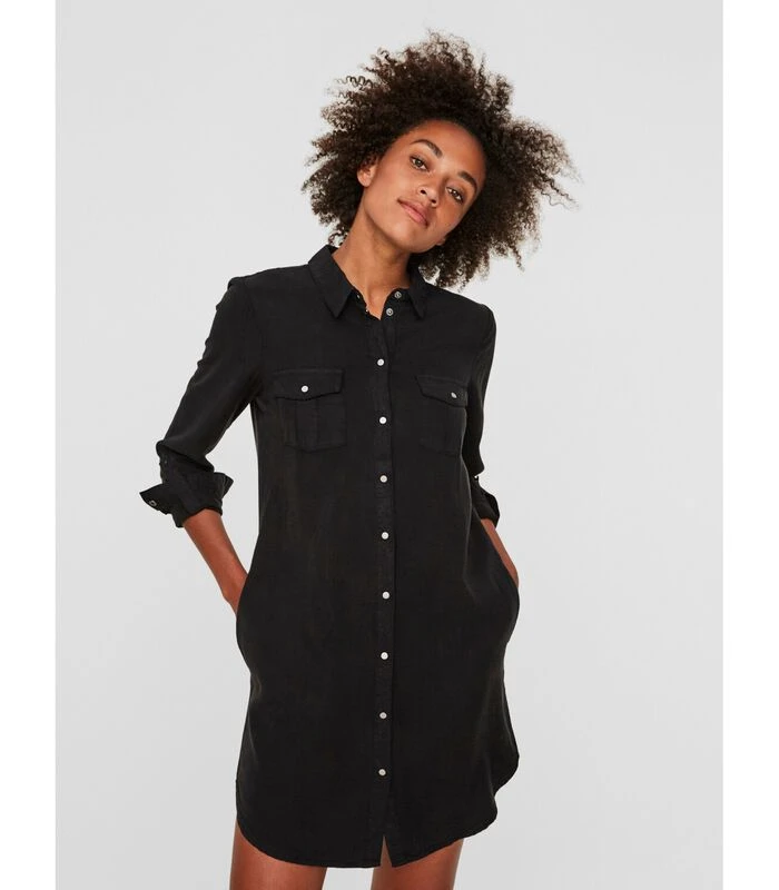 – Lengte: 90 cm in maat S.Model meet 177 cm en draagt maat S.Denim mini overhemdjurk met knoopsluiting, borstzakken en mouwomslagdetail. Draag de jurk met kleurrijke sneakers voor een casual look.