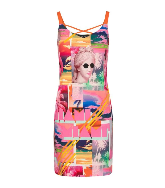 Wees kleurrijk en licht met deze vloeiende zomerjurk. We houden van zijn exclusieve kleurrijke print en zijn zeer vrouwelijke halslijn !Zomerjurk in bedrukte vloeiende jersey – Exclusief patroon voor BLEU D’AZUR – Geplaatste print – Recht model, lichtjes aansluitend op het lichaam – V–halslijn – Bandjes en bretels in oranje jersey – Zonder sluiting, om aan te trekken – BA–logo met kristallen strassteentjes op de rughalslijnWassen op 30°. Samenstelling : 95% POLYESTER 5% ELASTHANNE EN ITALIAANSE FABRIEK