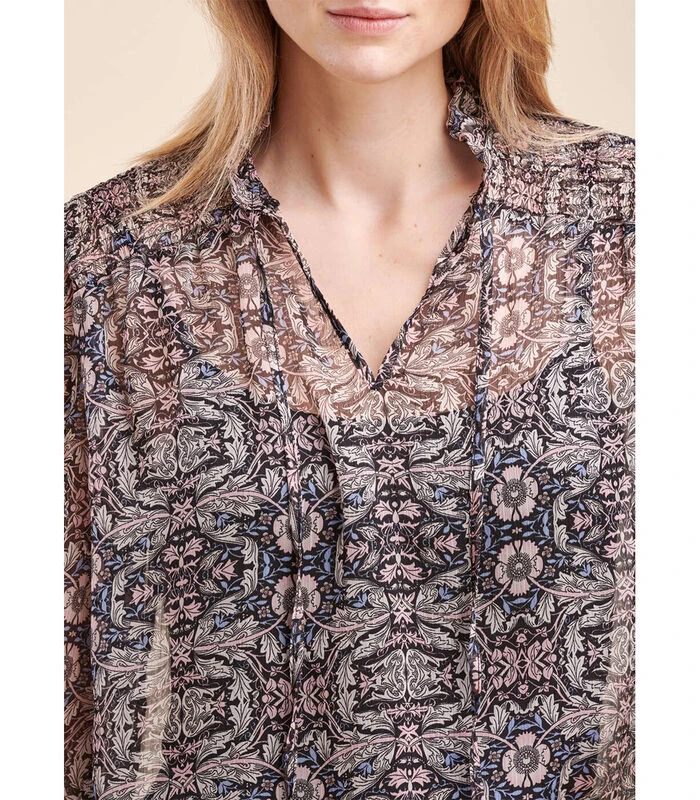 Voldoende top met bloemrijke print in polyester sluier, ronde halslijn met stuurwiel, spleet en vastgebonden schakels, lange puffende mouwen met vooroordelen, schouderpaneel met korrels. Top niet verdubbeld. Ons model meet 1m75 en heeft een maat 36/s. 100% Polyester
