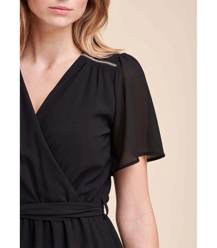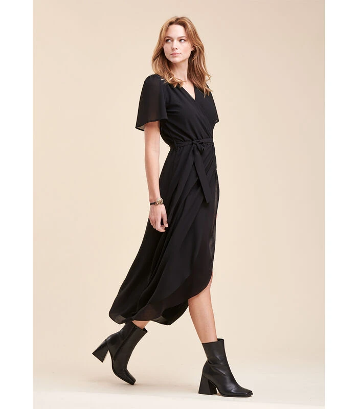Lange jurk van polyester voile, wikkelhals, korte mouwen, schouderuitsnijdingen met plooien en fantasievlechtwerk, elastische tailleโuitsnijding met ceintuur om vast te knopen, uitlopende onderkant met afgeronde overslag, gevoerde jurk. 100% Polyester Voering: 100% Viscose