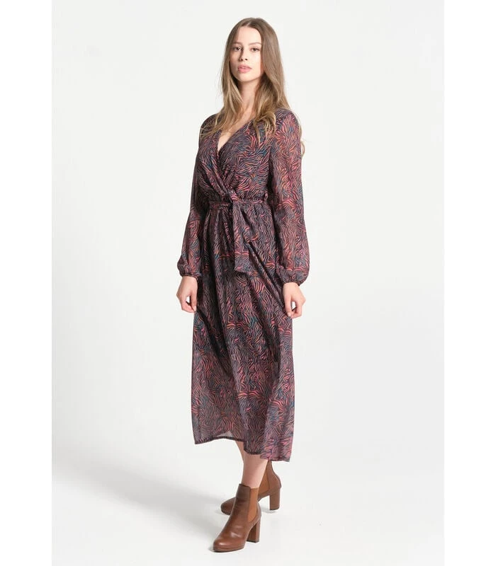 Snoeiende kleurrijke print geïnspireerd door de kleuren van de Andes Cordillera voor deze lange jurk met lichte textuur. Het heeft een shirtkraag met knoopsgat, lange mouwen en de grootte wordt onderstreept door een riem. Met zijn patroon met warme en gemengde tonen zal dit stuk ongetwijfeld het verschil maken in je garderobe.
